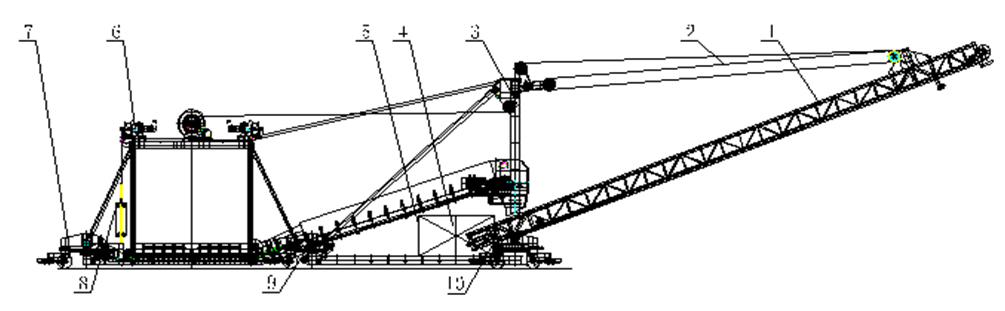 1. belt conveyor system, 2. arm frame pitching system, 3. metal structure, 4. diesel engine unit, 5. electrical system, 6. upper train and door frame, 7. walking mechanism, 8. counterweight system, 9. hydraulic system, 10. arm frame rotary mechanism.
